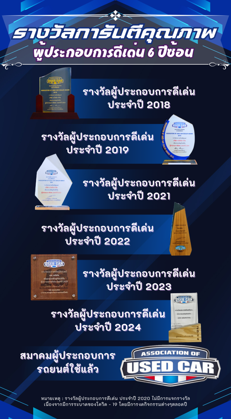 6.โชว์รูมรถมือสองที่มีรถคุณภาพและระบบการทำงานระบบการบริการครบวงจร One Stop Service ได้รับรางวัลการันตีคุณภาพ ผู้ประกอบการดีเด่น 6 ปีซ้อน จากสมาคมผู้ประกอบการรถยนต์ใช้แล้ว