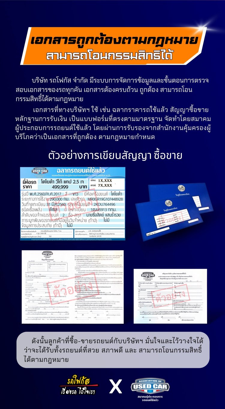 เอกสารที่ทางบริษัทฯ ใช้ เช่น ฉลากราคารถใช้แล้ว สัญญาซื้อขายหลักฐานการรับเงิน เป็นแบบฟอร์มที่ตรงตามมาตรฐาน จัดทำโดยสมาคมผู้ประกอบการรถยนต์ใช้แล้ว