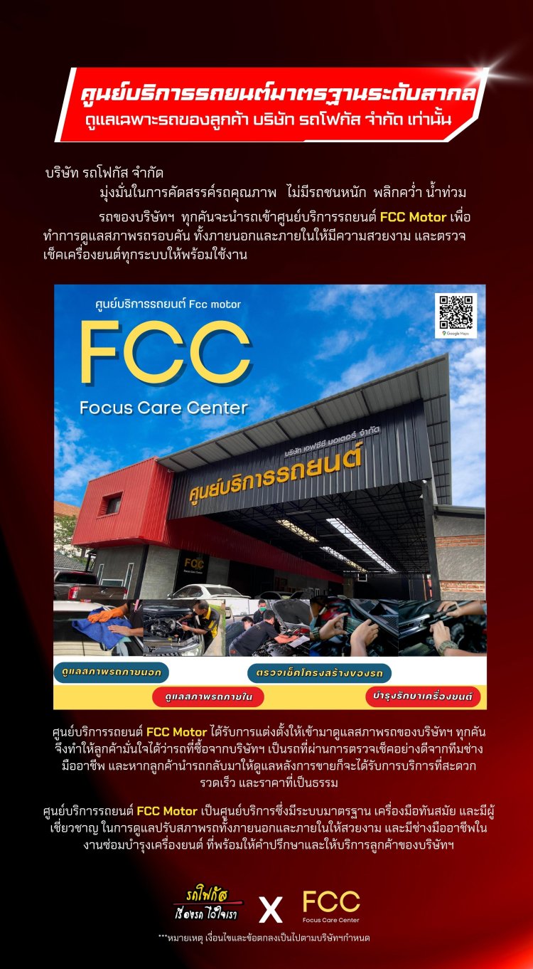 บริษัท รถโฟกัส จำกัด มุ่งมั่นในการคัดสรรค์รถคุณภาพ ไม่มีรถชนหนักพลิกคว่ำ ไม่มีน้ำท่วม รถของบริษัทฯ ทุกคันจะนำรถเข้าศูนย์บริการรถยนต์ FCC Motor